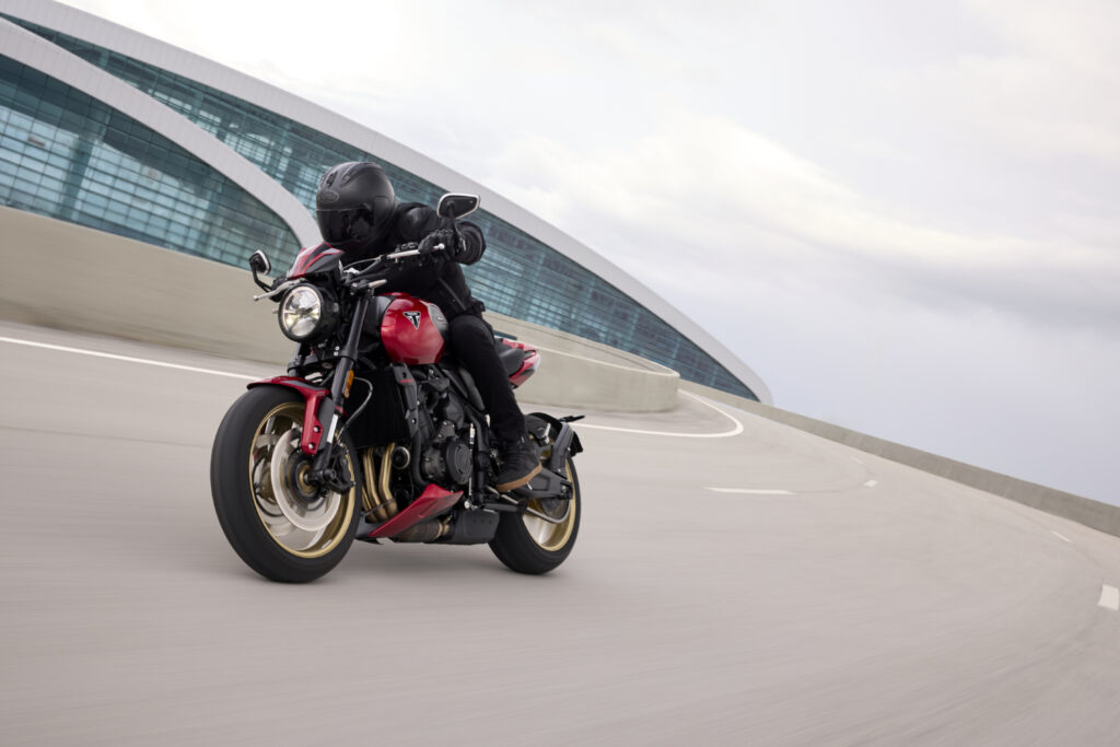 De nieuwe Trident 800 (vanaf maart 2026) is een krachtige naked bike met een 798 cc driecilinder die 115 pk en 84 Nm levert voor een vlotte en levendige rit.